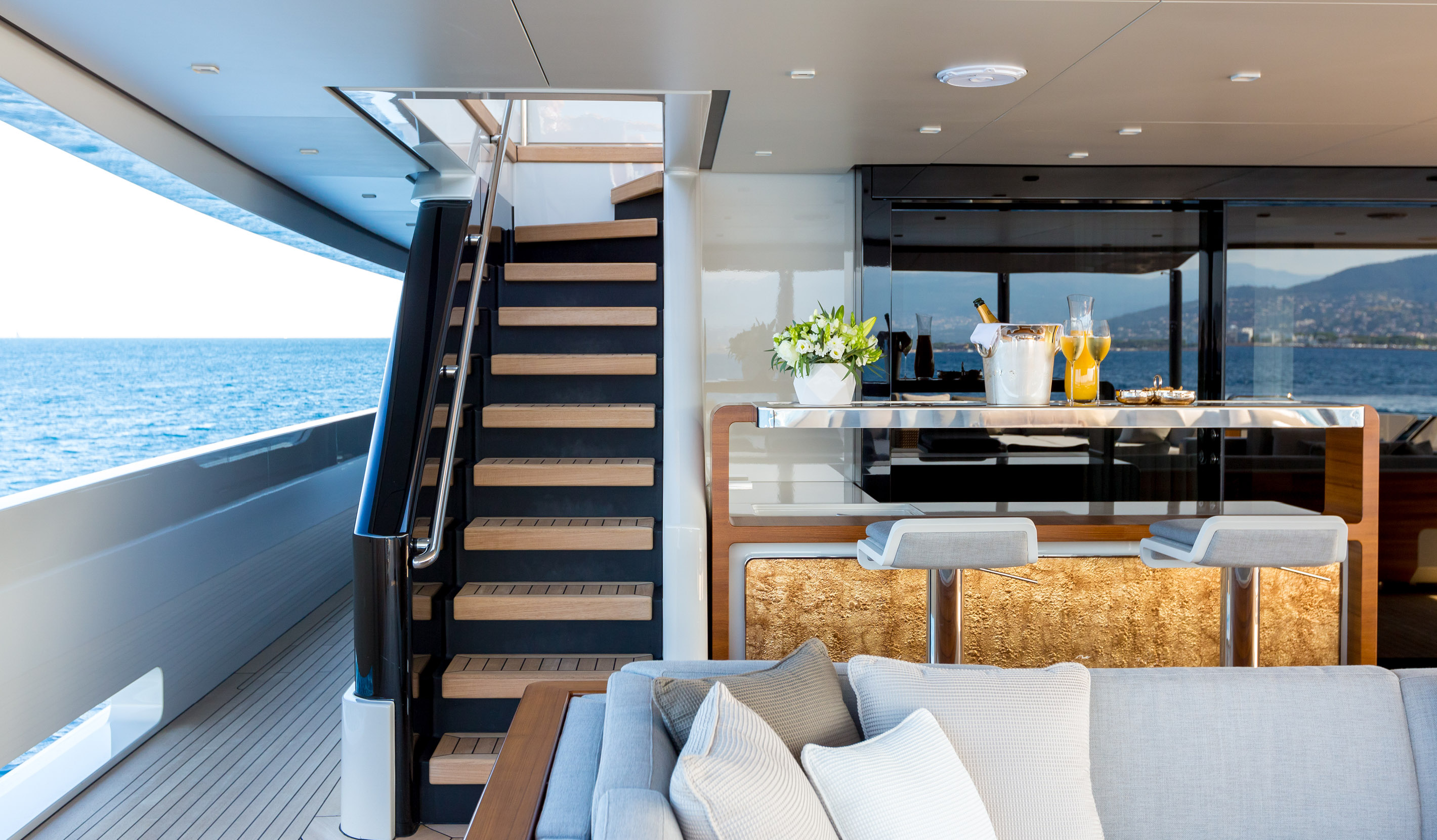 An example? Just unfold the transom platform to enjoy a water sport launching pad almost 4 meters deep. And more. Each of its deck spaces is as wide as your vision and offers a great variety of possibilities, allowing guests to always find the ideal spot outside. The master cabin comes with one or two folding terraces, as well as the aft deck, so you will always keep your contact with the environment.